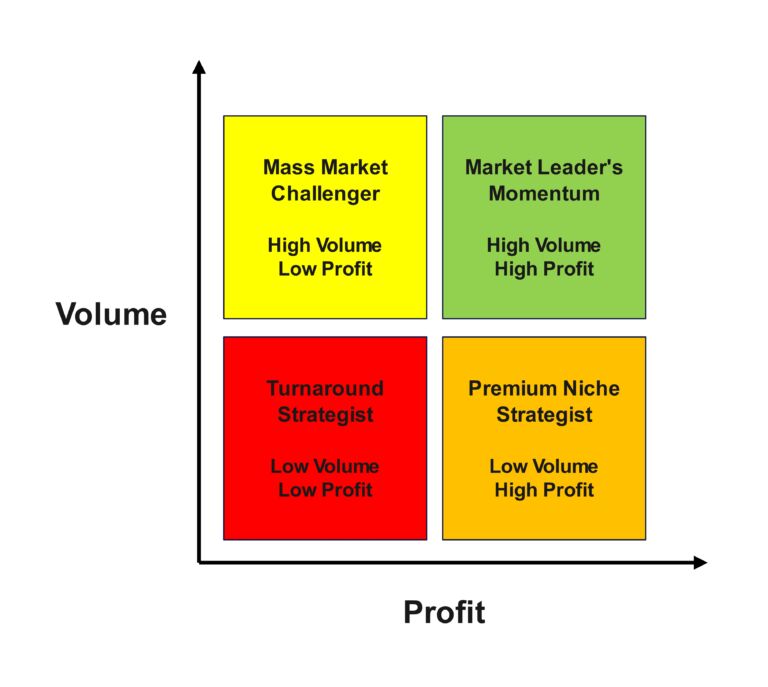 The 4 Strategies of Profit is a practical strategic framework that maps business positions based on two key dimensions: Volume and Profit. This 2×2 matrix reveals four distinct strategic profiles, helping businesses align their growth models with their economic realities.